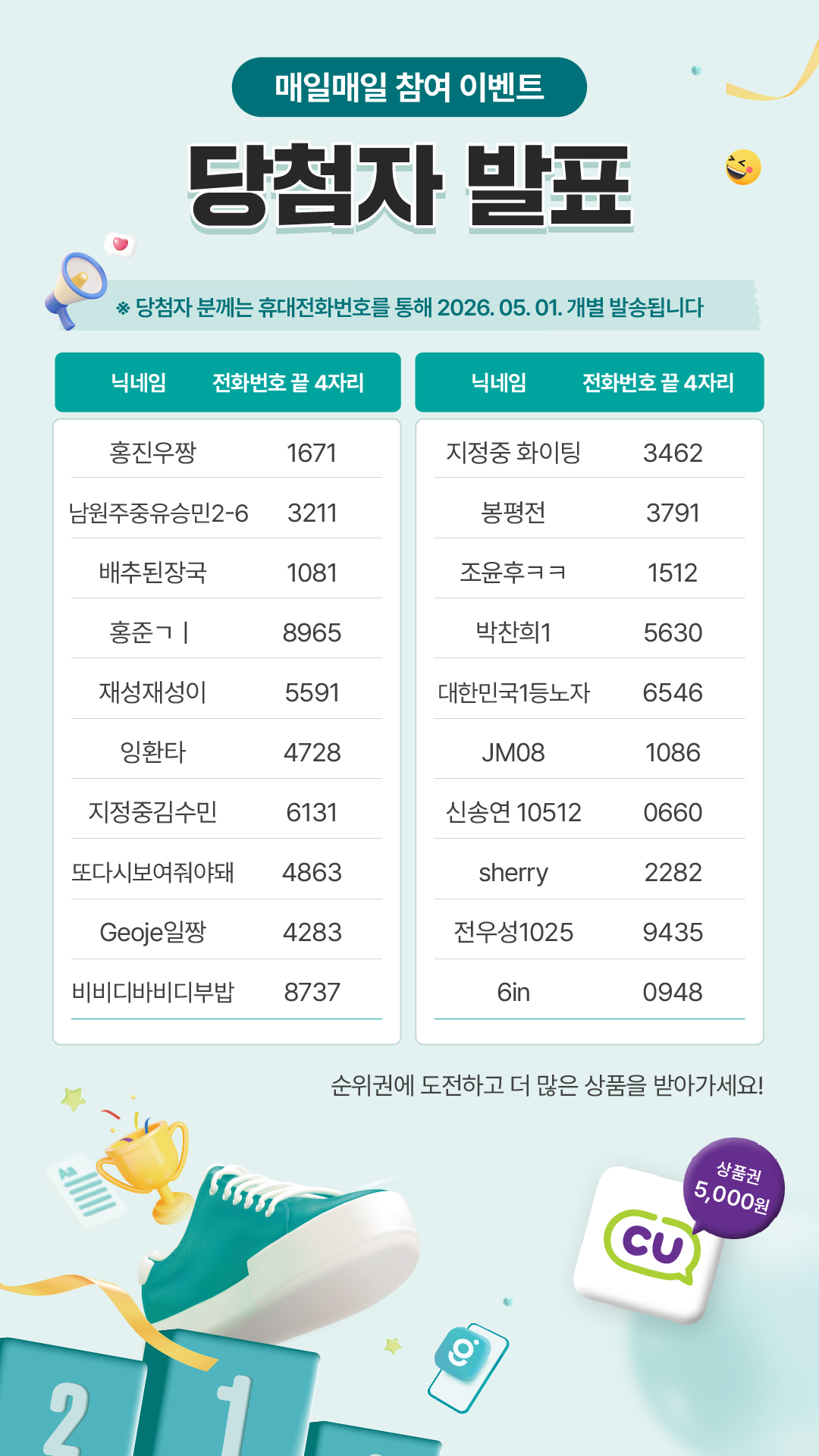 - 다음글 (4/17 당첨자 발표) 매일매일 CU모바일 상품권 당첨자 추첨! 관리자 2026.04.20