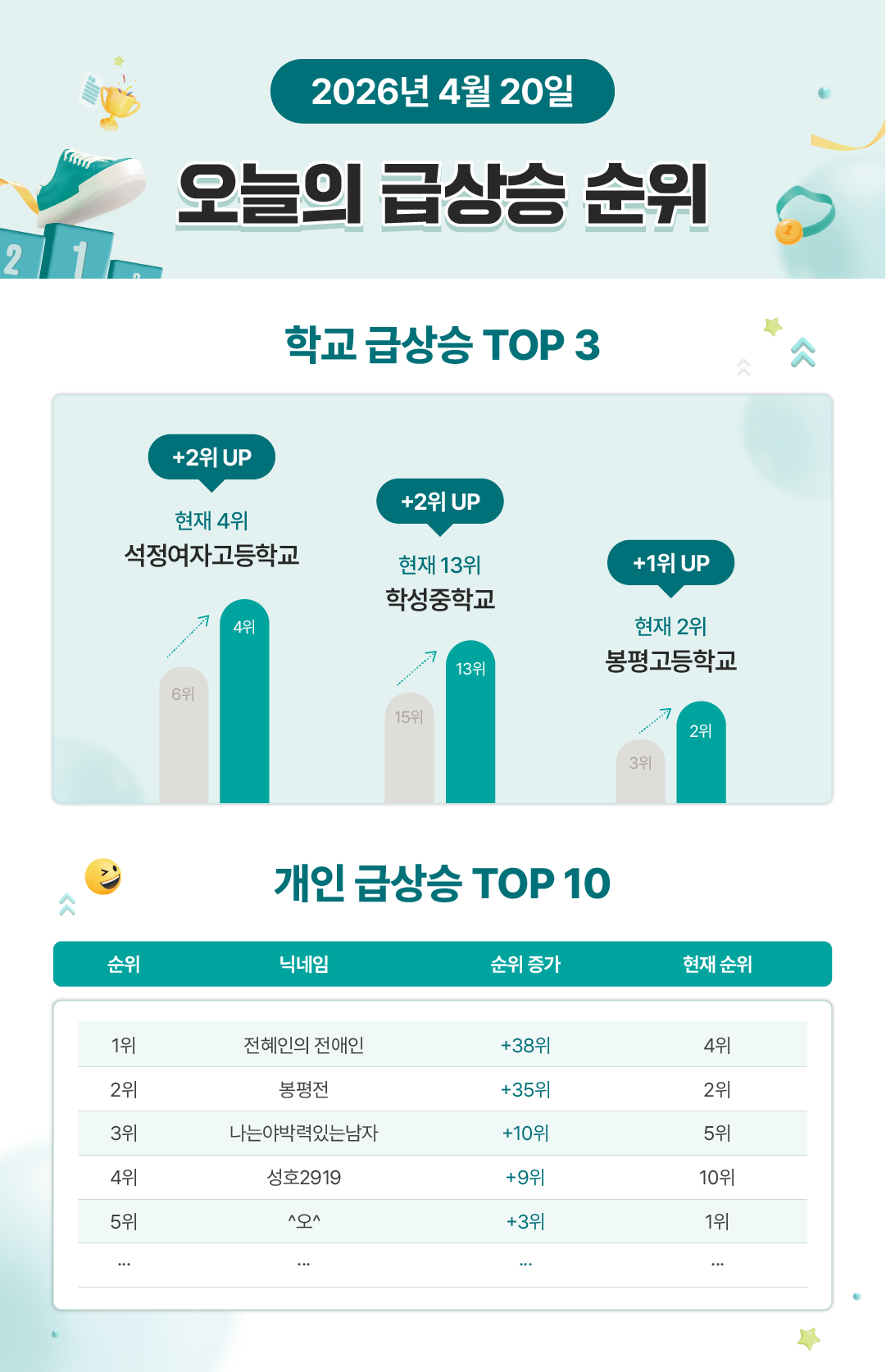 매일 순위가 바뀌고 치열하게 경쟁중인 걷기 챌린지! 🎉현재 강원도 20개 학교 급상승 순위와 개인 급상승 순위를 발표합니다🎉 실시간으로 바뀌는 순위를 보니 열기가 정말 대단해요🔥 마지막까지 뒤집기의 기회는 열려 있으니 끝까지 힘차게 걸어봐요! 함께 걷는 즐거움, HI-WALK 챌린지 [지금 바로 참여하기] 👉 https://www.hiwalk.co.kr/challenge/guide ------ 문의: HI-WALK 캠페인 운영사무국 (02-332-6813 | info@hiwalk.co.kr) |